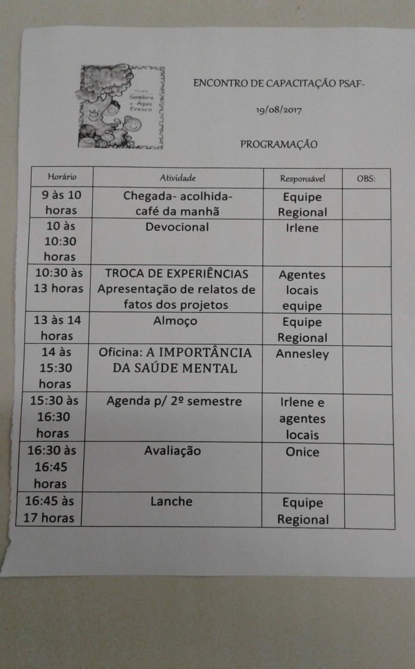 - A Alda falou pelo Projeto Viver e Crescer em Bandeirinha – Betim e esclareceu que o projeto existe desde 2004 e a partir de 2011 passou a ter personalidade jurídica. Tem CPNJ próprio o que proporcionou algumas parcerias importantes e enriquecedoras. Ultimamente listaram algumas necessidades e conseguiram mais de 20 itens como geladeira, computadores, etc. Passaram por um período difícil com a ausência de Onice quando ela foi para o SAF Nova Almeida, mas agora, mediante sua volta, o Projeto retomou sua caminhada com mais energia. Funciona de quarta a sábado e atende uma média de 40 crianças. Atualmente conta com um casal de voluntários Leia e Cid na área do Esporte. Sendo que Leia estava presente neste encontro. O Projeto sonha com encontros regulares com as famílias das crianças porque reconhece a importância da parceria. Contaram ainda que viveram bons momentos com a Festa da Colheita e outras celebrações. Relataram que cumpriram todo o currículo proposto para o 1º semestre da Educação Cristã.