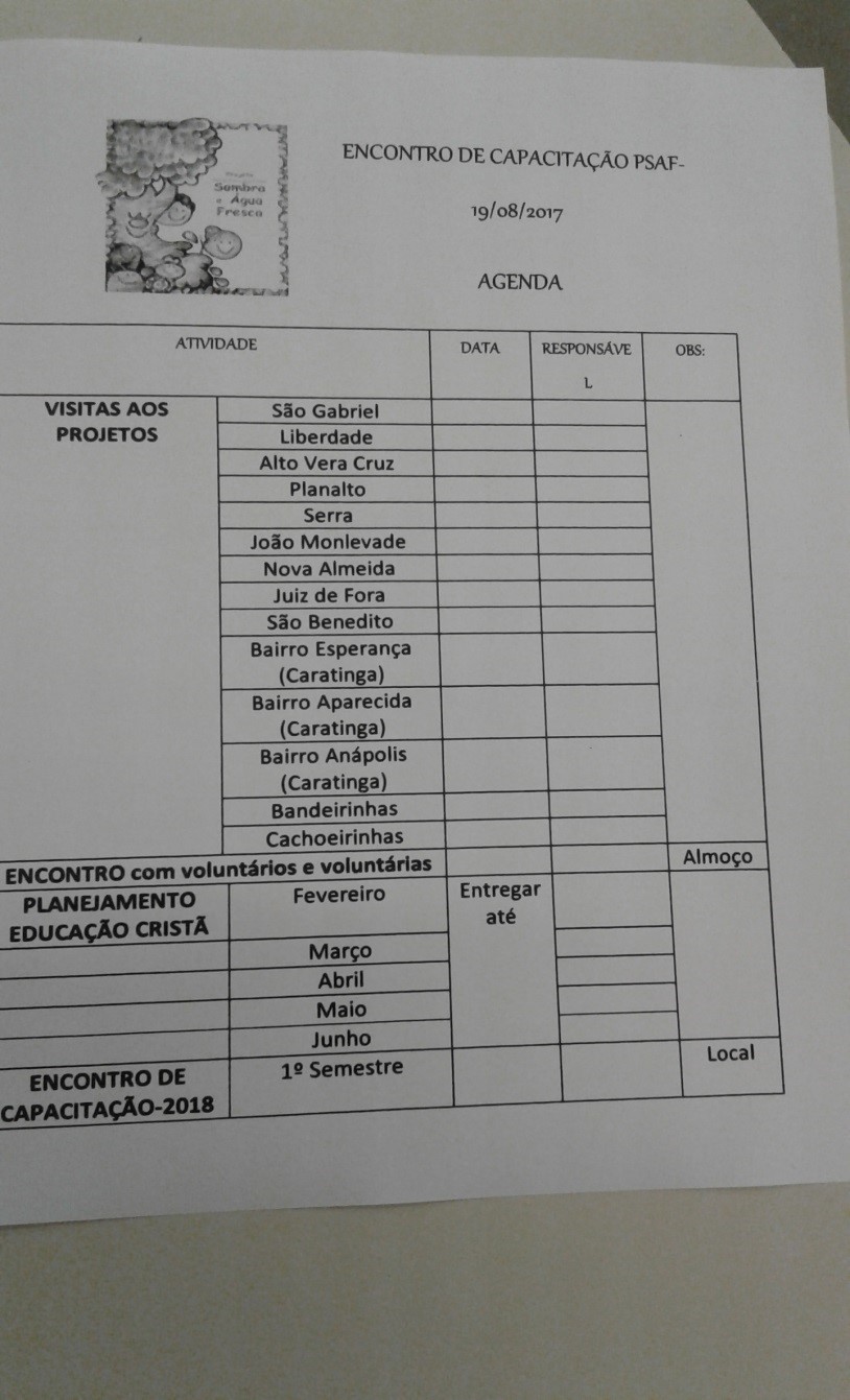 Irlene justificou a ausência do Projeto SAF de Juiz-de-fora, um dos mais recentes da região, que atende cerca de 80 crianças sob a liderança de Selma e Marcelo. Eles enviaram um vídeo com o histórico e as atividades mais recentes. Também foi justificada a ausência dos Projetos de Caratinga que também enviaram vídeo com suas atividades e ostensiva projeção na Comunidade, onde são atendidas cerca de 90 crianças em 3 Projetos: Aparecida, Esperança e Anápolis.